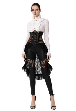 Le serre-taille est orné d'une traine en dentelle noire courte sur les cotés et longue à l'arrière.