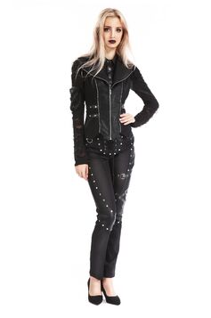 pantalon métal femme Simili-cuir et sangles avec Oeillets en acier comportant un peut de dentelle.