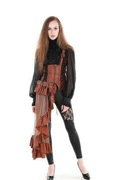 Superbe serre-taille steampunk gothique aristocrate pour femme disposant d'un laçage dans le dos et d'une fermeture éclair sur le devant. De plus ce serre-taille est accompagné d'une magnifique traine sur le coté.
