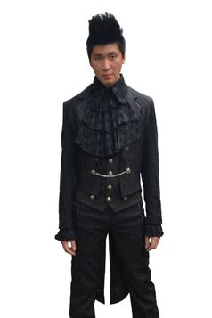 Veste aristocrate queue de pie pour homme, en tissu noir accompagné de motif brocard et de 6 boutons argentés situé sur le dos de la veste et d'une petite chaine sur le devant. Facile et agréable à porter, ce porte très bien avec une chemise.